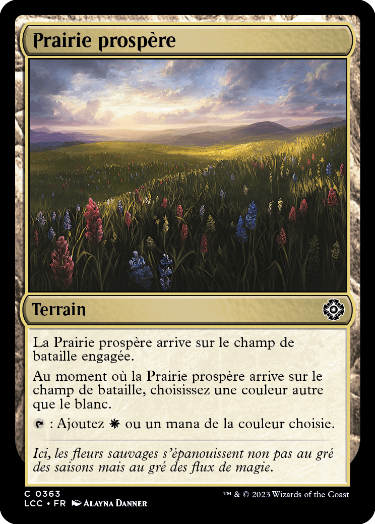 Au moment où la Prairie prospère arrive sur le champ de bataille, choisissez une couleur autre que le blanc. : Ajoutez ou un mana de la couleur choisie.
