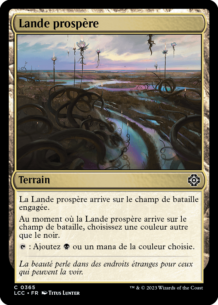 Au moment où la Lande prospère arrive sur le champ de bataille, choisissez une couleur autre que le noir. : Ajoutez ou un mana de la couleur choisie.