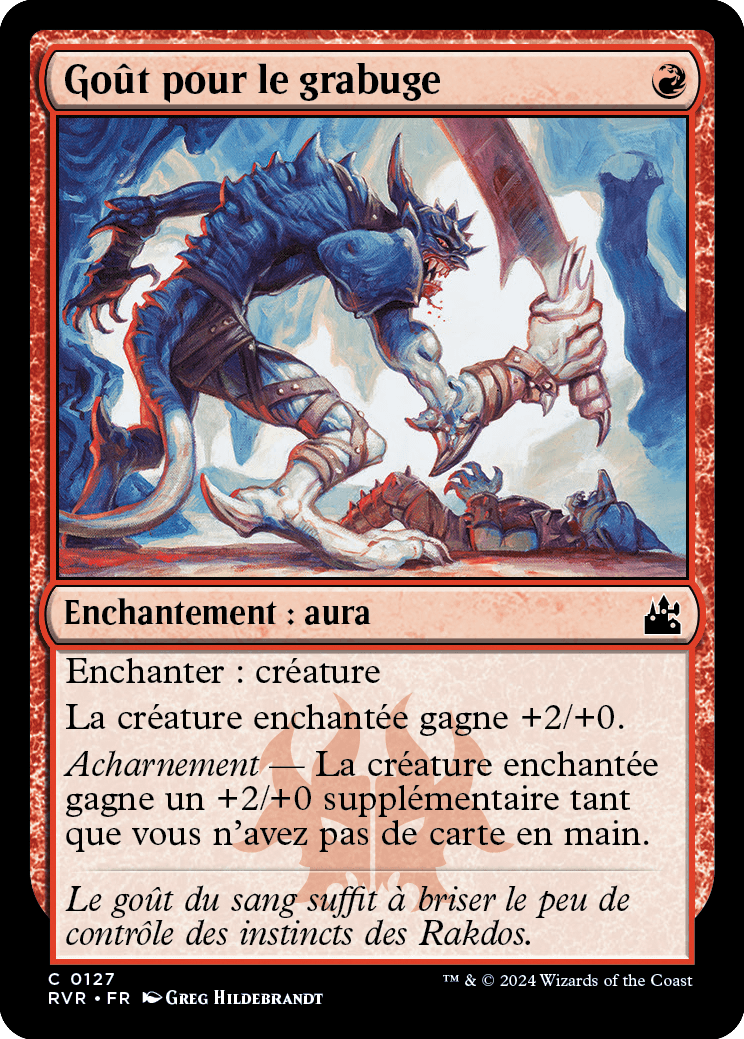 Acharnement — La créature enchantée gagne +2/+0 supplémentaires tant que vous n'avez pas de carte dans votre main.