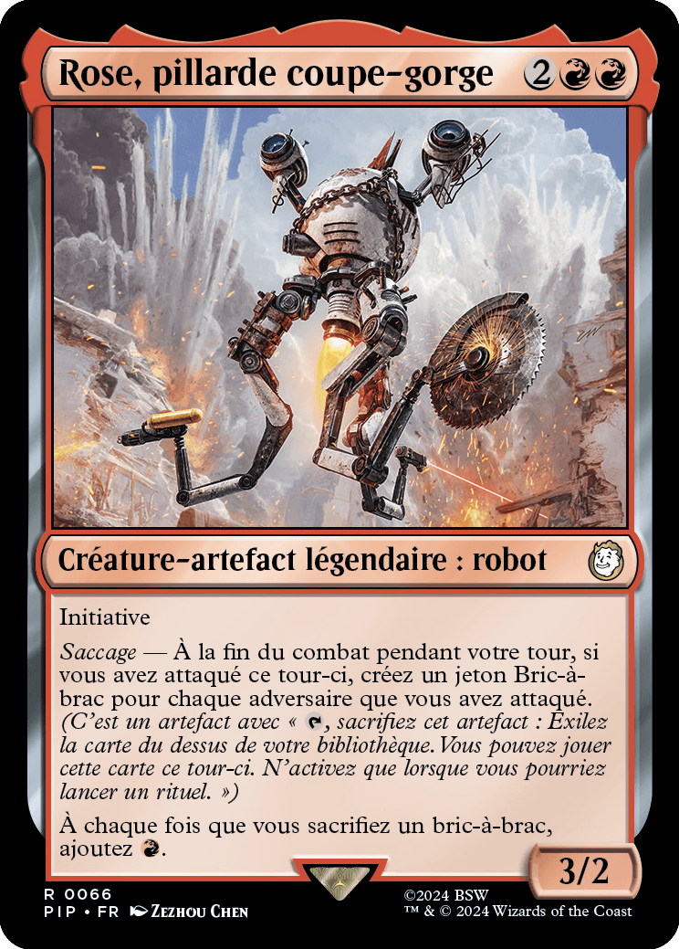 Saccage — À la fin du combat pendant votre tour, si vous avez attaqué ce tour-ci, créez a jeton Bric-à-brac pour chaque adversaire que vous avez attaqué.
