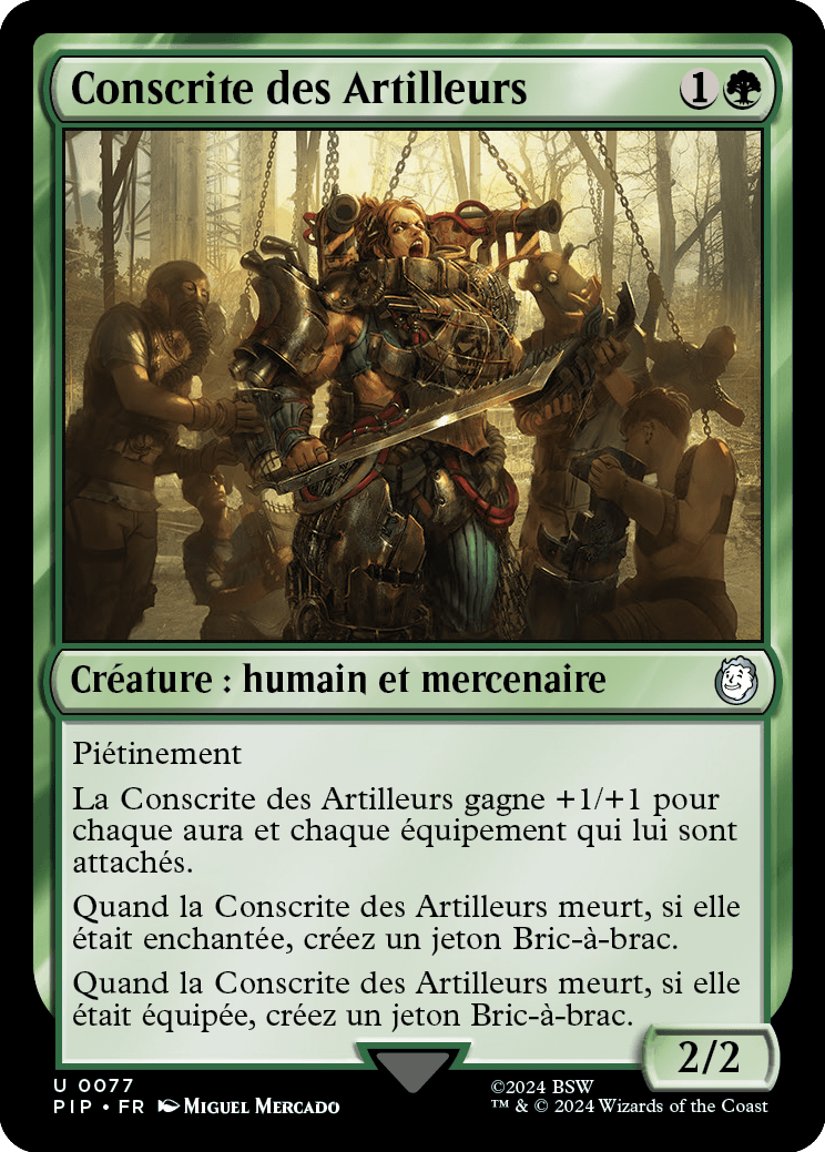 La Conscrite des Artilleurs gagne +1/+1 pour chaque aura et chaque équipement qui lui sont attachés.