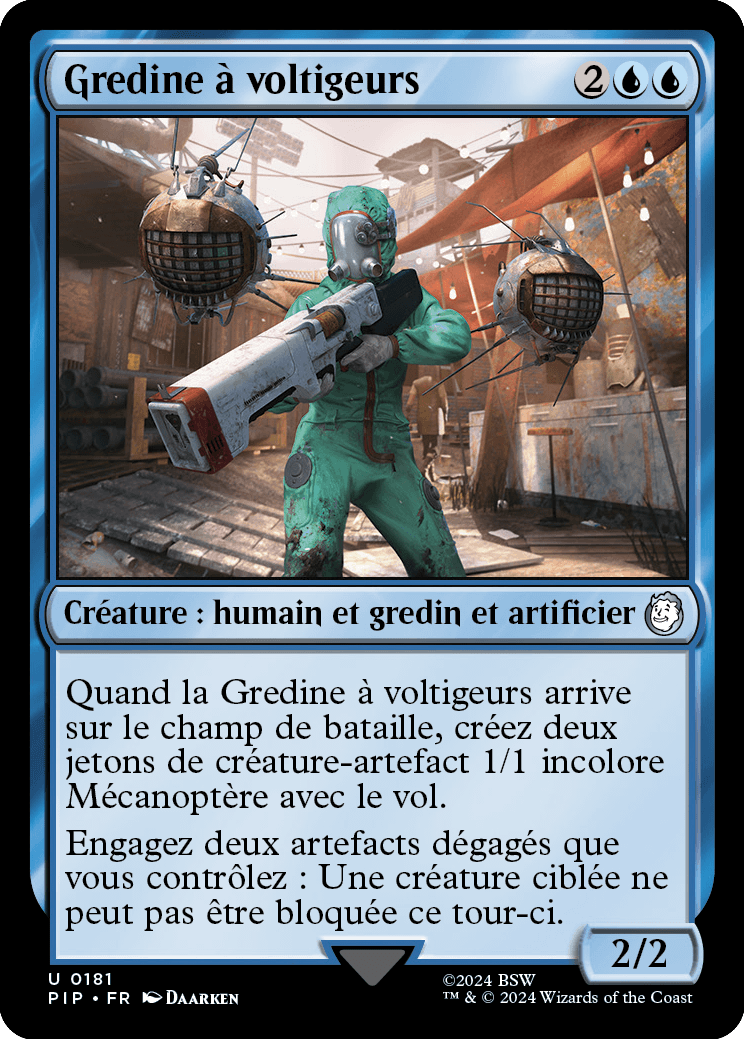 Quand la Gredine à voltigeurs arrive sur le champ de bataille, créez deux jetons de créature-artefact 1/1 incolore Mécanoptère avec le vol.