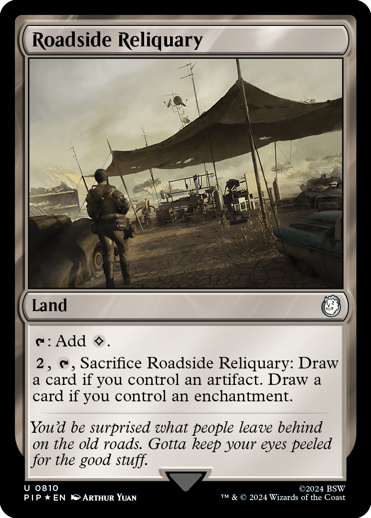 , sacrifiez le Reliquaire en bord de route : Piochez une carte si vous contrôlez un artefact. Piochez une carte si vous contrôlez un enchantement.