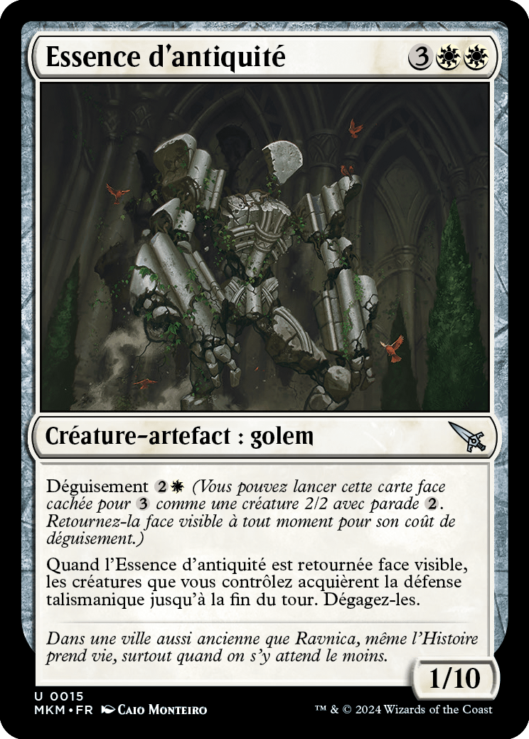 Quand l'Essence d'antiquité est retournée face visible, les créatures que vous contrôlez acquièrent la défense talismanique jusqu'à la fin du tour. Dégagez-les.