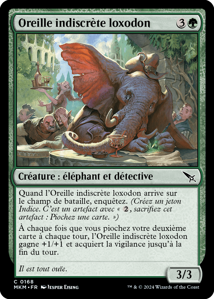À chaque fois que vous piochez votre deuxième carte à chaque tour, l'Oreille indiscrète loxodon gagne +1/+1 et acquiert la vigilance jusqu'à la fin du tour.