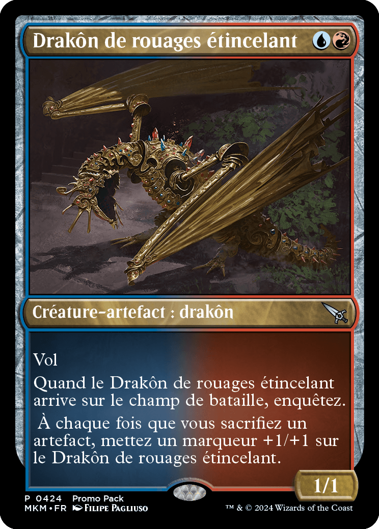 À chaque fois que vous sacrifiez un artefact, mettez un marqueur +1/+1 sur le Drakôn de rouages étincelant.