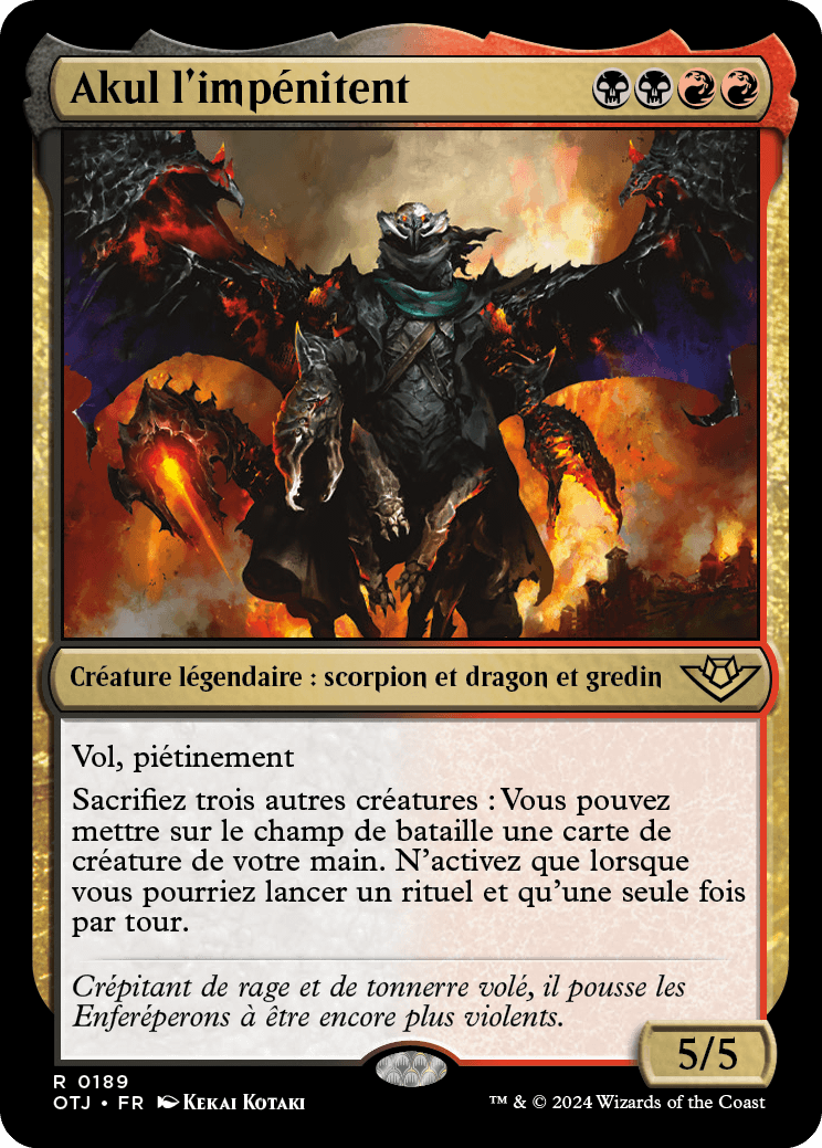Sacrifiez trois autres créatures : Vous pouvez mettre sur le champ de bataille une carte de créature de votre main. N'activez que lorsque vous pourriez lancer un rituel et qu'une seule fois par tour.