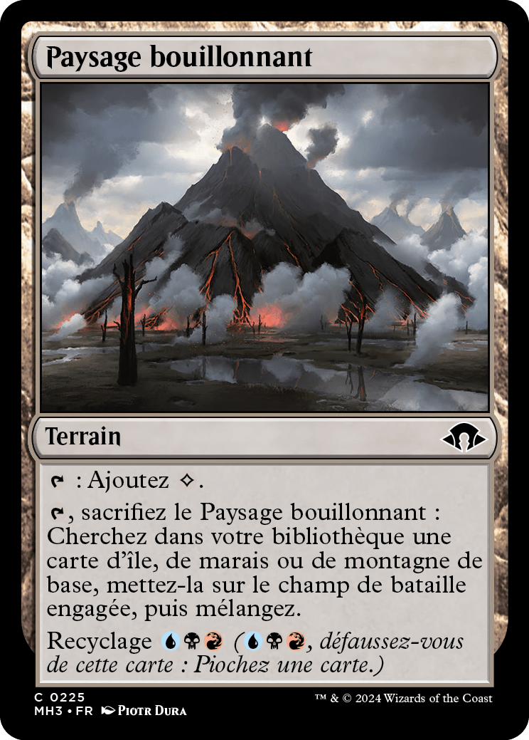 : Ajoutez . , sacrifiez le Paysage bouillonnant : Cherchez dans votre bibliothèque une carte d'île, de marais ou de montagne de base, mettez-la sur le champ de bataille engagée, puis mélangez.