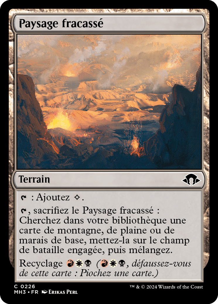 : Ajoutez . , sacrifiez le Paysage fracassé : Cherchez dans votre bibliothèque une carte de montagne, de plaine, ou de marais de base, mettez-la sur le champ de bataille engagée, puis mélangez.