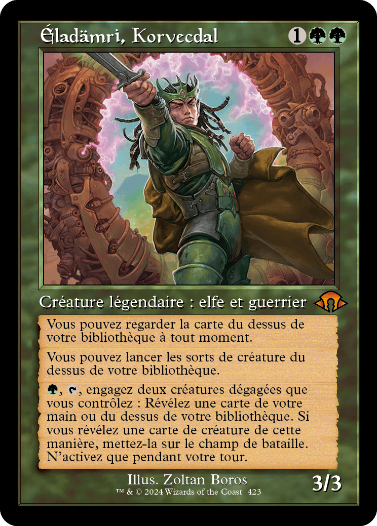 , engagez deux créatures dégagées que vous contrôlez : Révélez une carte de votre main ou du dessus de votre bibliothèque. Si vous révélez une carte de créature de cette manière, mettez-la sur le champ de bataille. N'activez que pendant votre tour.