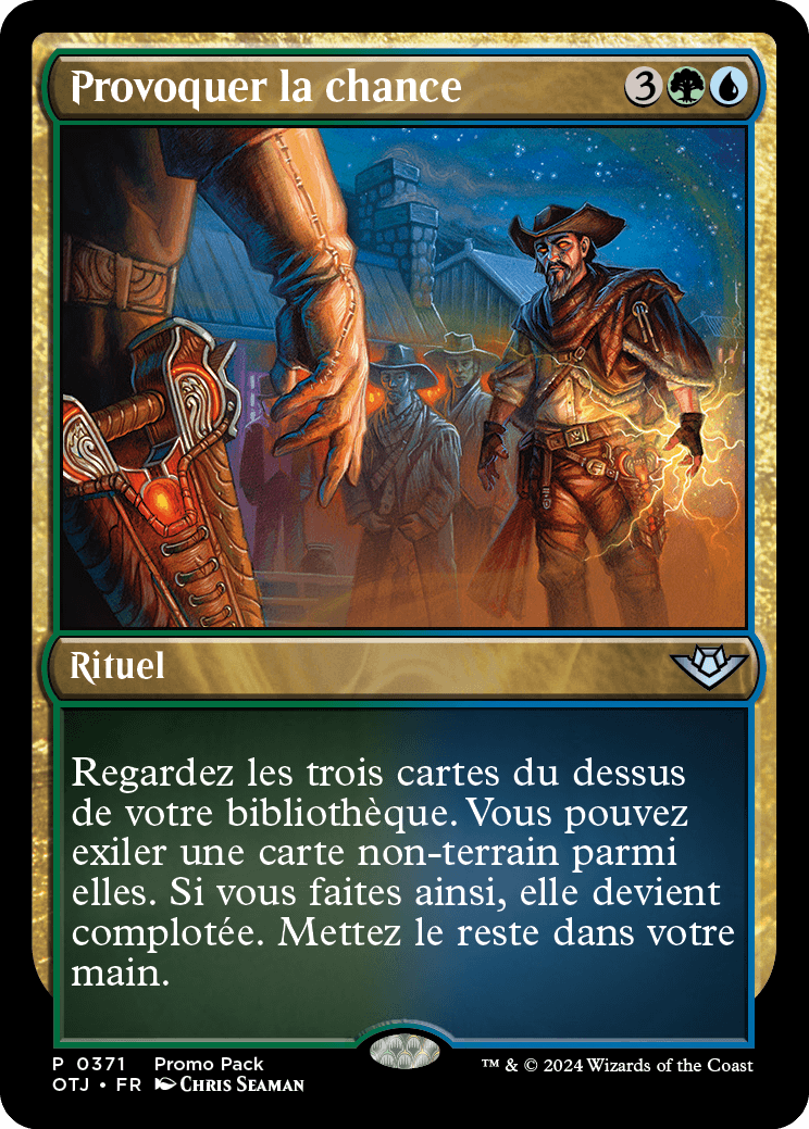 Regardez les trois cartes du dessus de votre bibliothèque. Vous pouvez exiler une carte non-terrain parmi elles. Si vous faites ainsi, elle devient complotée. Mettez le reste dans votre main. (Vous pouvez la lancer comme un rituel pendant un autre tour sans payer son coût de mana.).