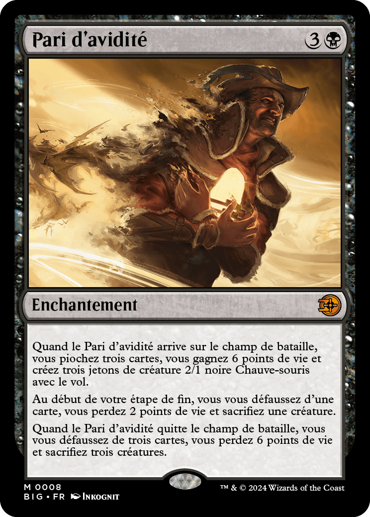 When Greed's Gambit enters the battlefield, you draw three cards, gain 6 life, and create three 2/1 black Bat creature tokens with flying.