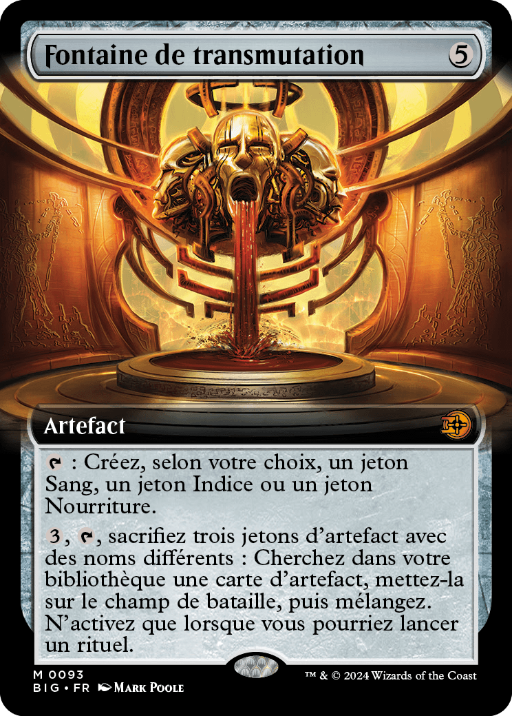 , sacrifiez trois jetons d'artefact avec des noms différents : Cherchez dans votre bibliothèque une carte d'artefact, mettez-la sur le champ de bataille, puis mélangez. N'activez que lorsque vous pourriez lancer un rituel.