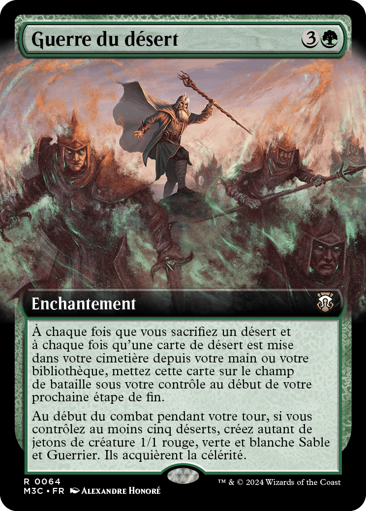 At the beginning of combat on your turn, if you control five or more Deserts, create that many 1/1 red, green, and white Sand Warrior creature tokens. They gain haste.