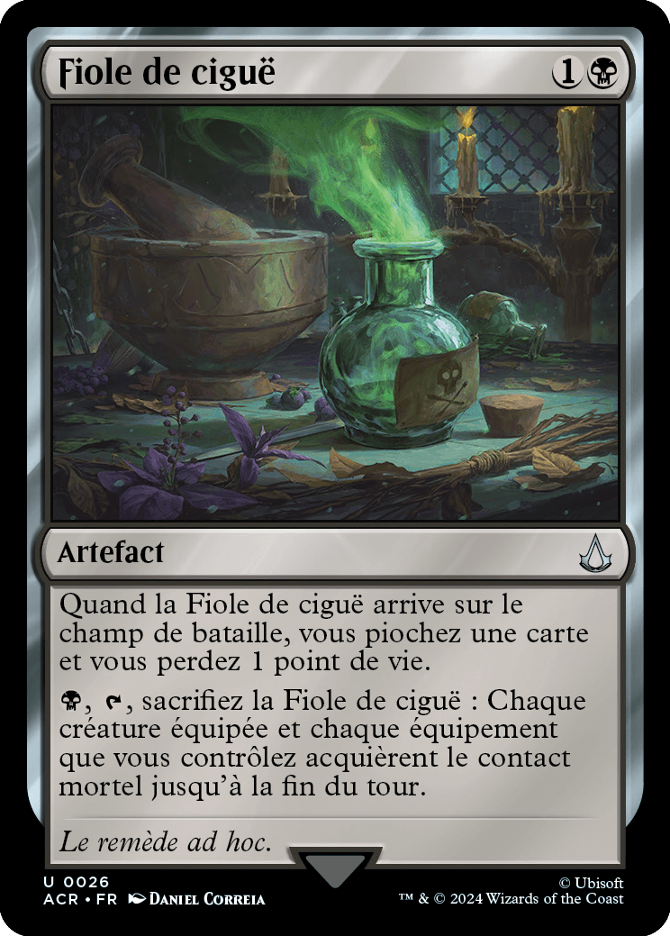 , sacrifiez la Fiole de ciguë : Chaque créature équipée et chaque équipement que vous contrôlez acquiert le contact mortel jusqu'à la fin du tour.