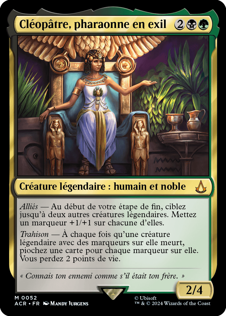 Trahison — À chaque fois qu'une créature légendaire avec des marqueurs sur elle meurt, piochez une carte pour chaque marqueur sur elle. Vous perdez 2 points de vie.