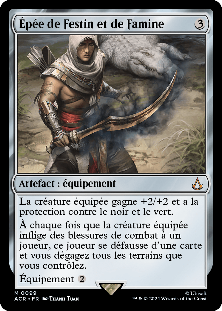 À chaque fois que la créature équipée inflige des blessures de combat à un joueur, ce joueur se défausse d'une carte et vous dégagez tous les terrains que vous contrôlez.