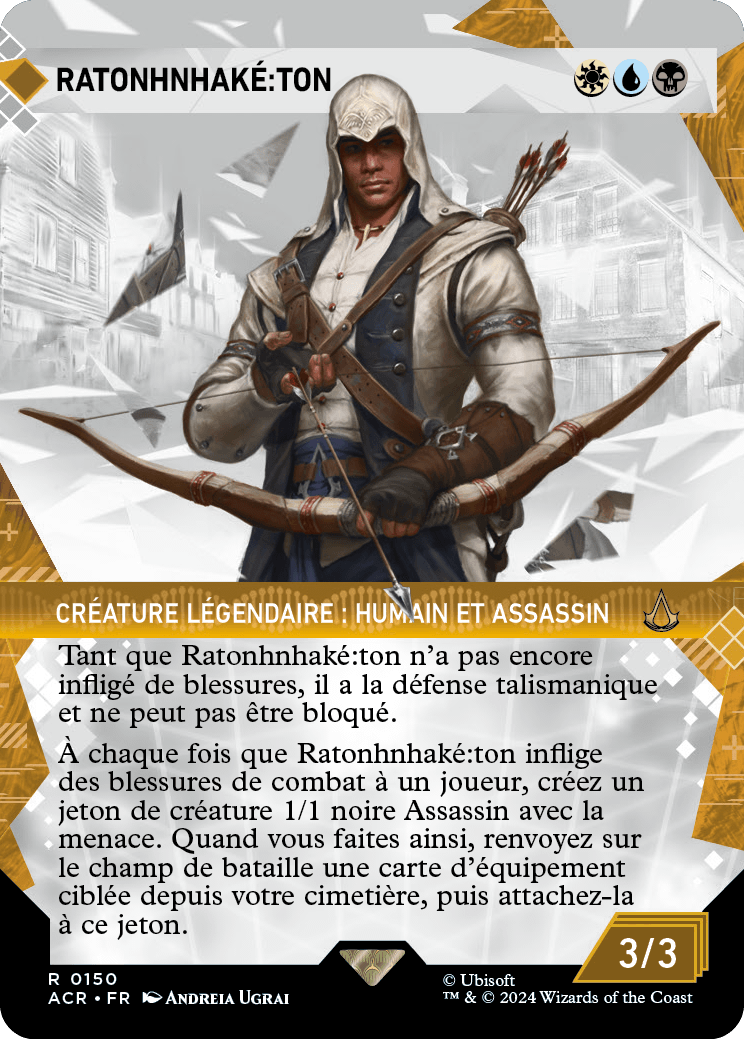 À chaque fois que Ratonhnhaké:ton inflige des blessures de combat à un joueur, créez un jeton de créature 1/1 noire Assassin avec la menace. Quand vous faites ainsi, renvoyez sur le champ de bataille une carte d'équipement ciblée depuis votre cimetière, puis attachez-la à ce jeton.