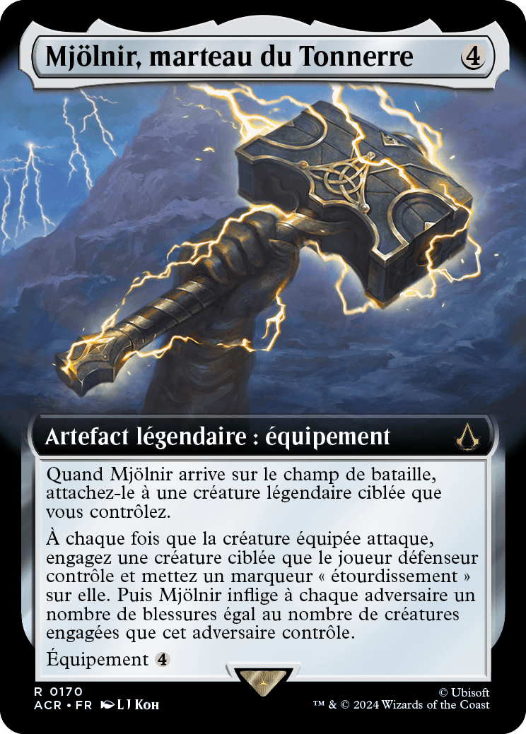 À chaque fois que la créature équipée attaque, engagez une créature ciblée que le joueur défenseur contrôle et mettez un marqueur "étourdissement" sur elle. Puis Mjölnir inflige à chaque adversaire un nombre de blessures égal au nombre de créatures engagées que cet adversaire contrôle.
