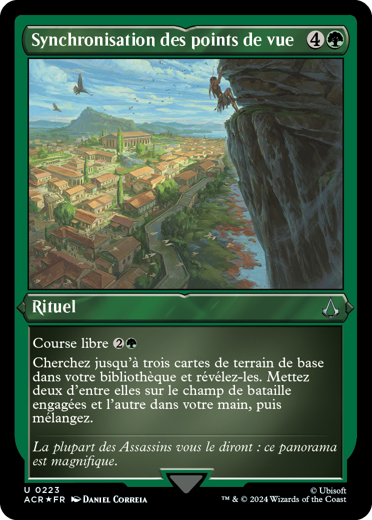 Cherchez jusqu'à trois cartes de terrain de base dans votre bibliothèque et révélez-les. Mettez deux d'entre elles sur le champ de bataille engagées et l'autre dans votre main, puis mélangez.