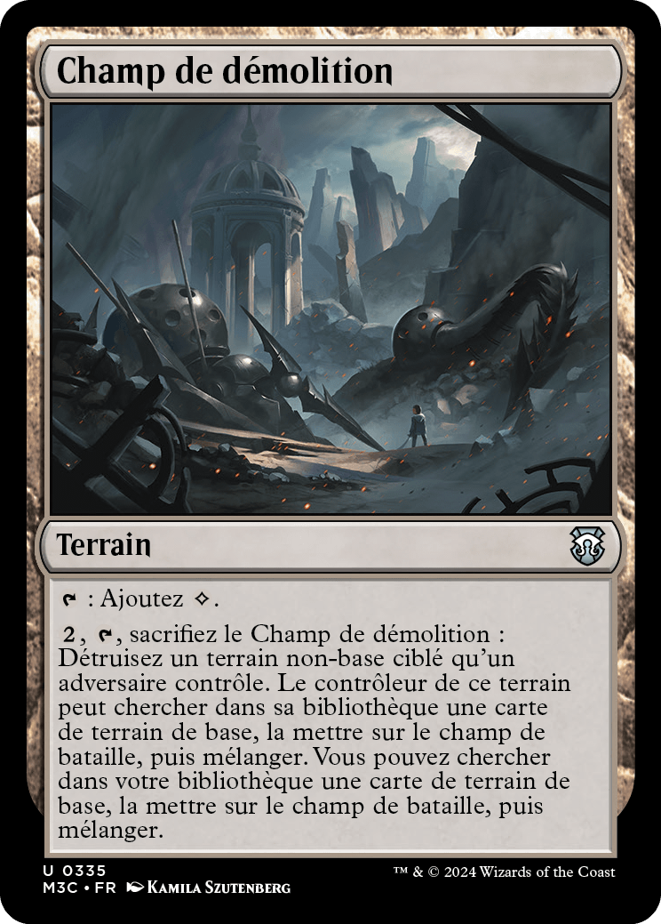 , , sacrifiez le Champ de démolition : Détruisez un terrain non-base ciblé qu'un adversaire contrôle. Le contrôleur de ce terrain peut chercher dans sa bibliothèque une carte de terrain de base, la mettre sur le champ de bataille, puis mélanger. Vous pouvez chercher dans votre bibliothèque une carte de terrain de base, la mettre sur le champ de bataille, puis mélanger.