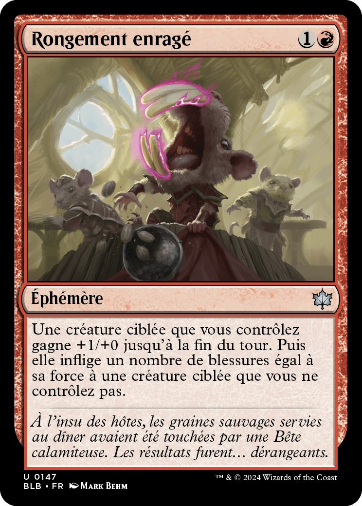 Une créature ciblée que vous contrôlez gagne +1/+0 jusqu'à la fin du tour. Puis elle inflige un nombre de blessures égal à sa force à une créature ciblée que vous ne contrôlez pas.