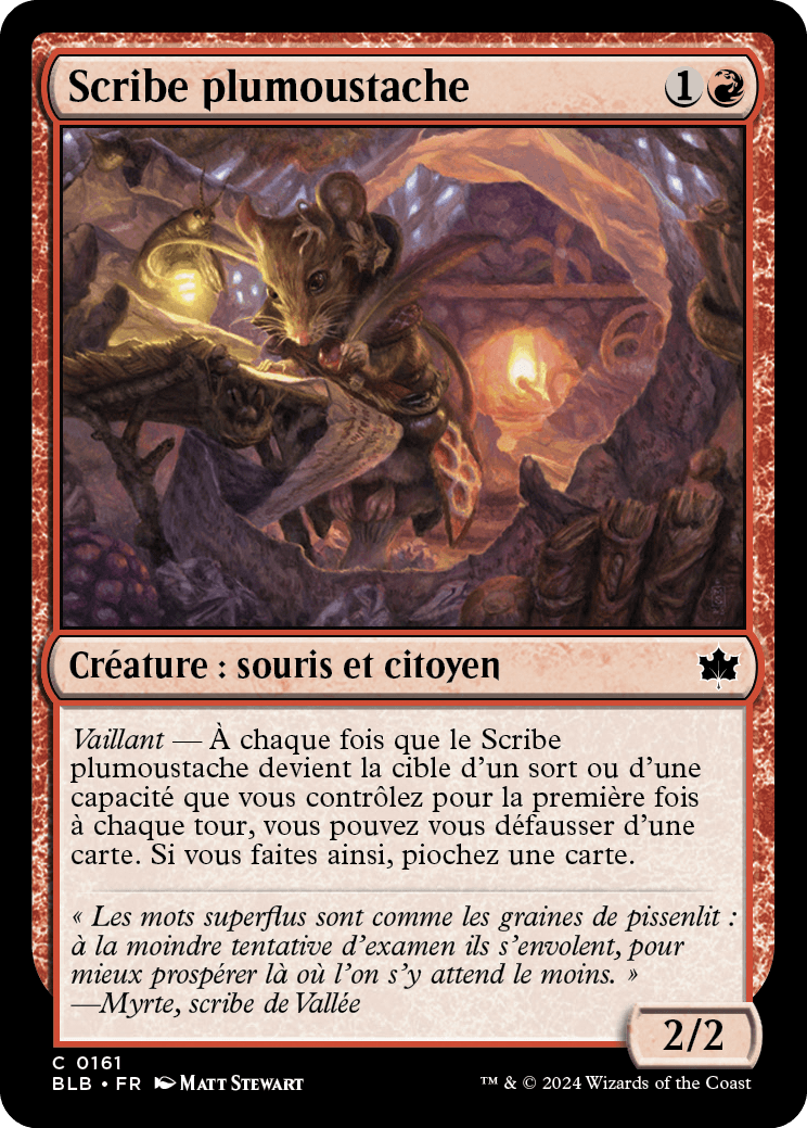 Vaillant — À chaque fois que le Scribe plumoustache devient la cible d'un sort ou d'une capacité que vous contrôlez pour la première fois à chaque tour, vous pouvez vous défausser d'une carte. Si vous faites ainsi, piochez une carte.
