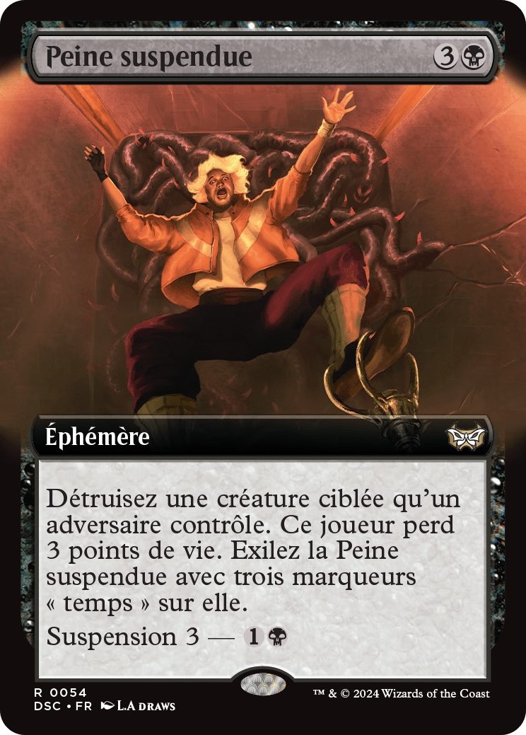 Détruisez une créature ciblée qu'un adversaire contrôle. Ce joueur perd 3 points de vie. Exilez la Peine suspendue avec trois marqueurs "temps" sur elle.