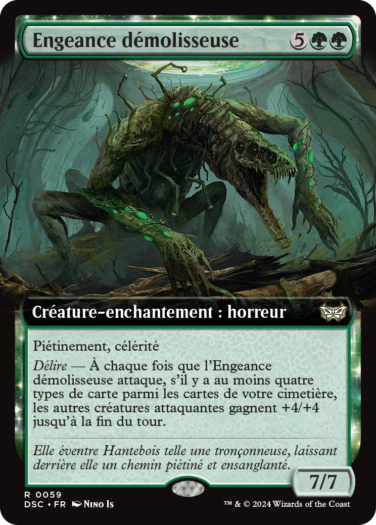 Délire — À chaque fois que l'Engeance démolisseuse attaque, s'il y a au moins quatre types de carte parmi les cartes de votre cimetière, les autres créatures attaquantes gagnent +4/+4 jusqu'à la fin du tour.