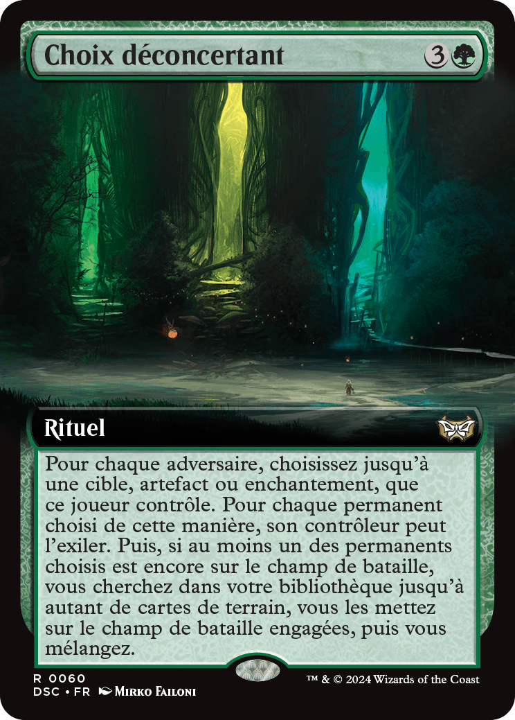 Pour chaque adversaire, choisissez jusqu'à une cible, artefact ou enchantement, que ce joueur contrôle. Pour chaque permanent choisi de cette manière, son contrôleur peut l'exiler. Puis, si au moins un des permanents choisis est encore sur le champ de bataille, vous cherchez dans votre bibliothèque jusqu'à autant de cartes de terrain, vous les mettez sur le champ de bataille engagées, puis vous mélangez.