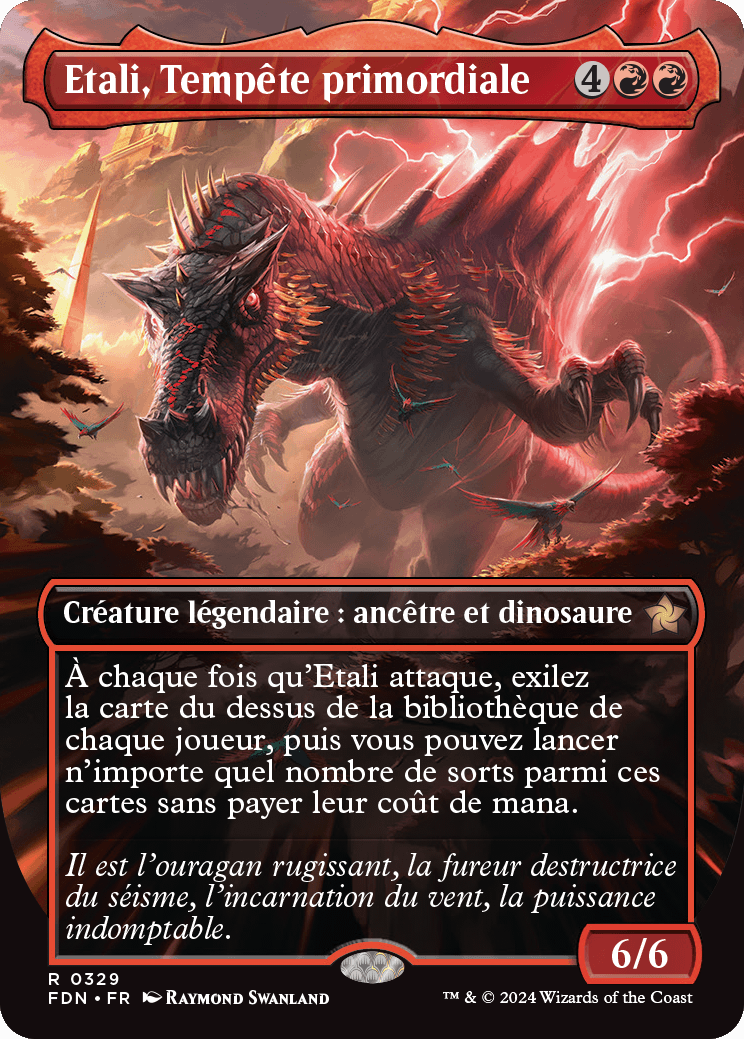 À chaque fois qu'Etali, Tempête primordiale attaque, exilez la carte du dessus de la bibliothèque de chaque joueur, puis vous pouvez lancer n'importe quel nombre de sorts parmi ces cartes sans payer leur coût de mana.