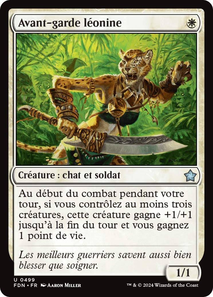 Au début du combat pendant votre tour, si vous contrôlez au moins trois créatures, l'Avant-garde léonine gagne +1/+1 jusqu'à la fin du tour et vous gagnez 1 point de vie.