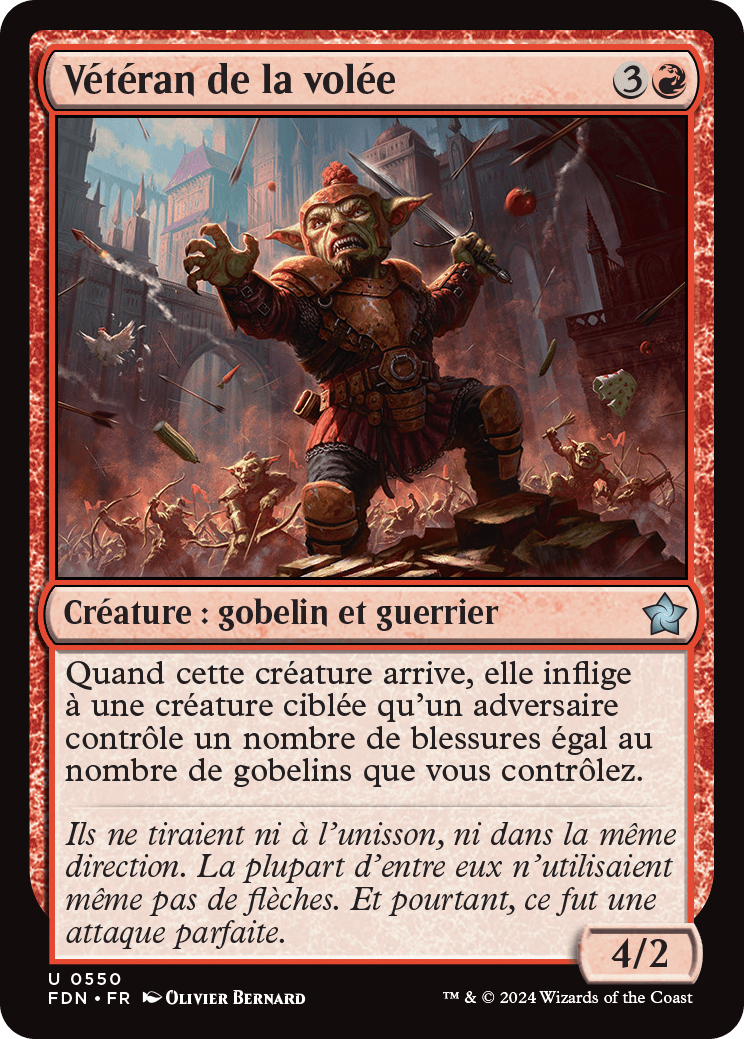 Quand le Vétéran de la volée arrive, il inflige à une créature ciblée qu'un adversaire contrôle un nombre de blessures égal au nombre de gobelins que vous contrôlez.