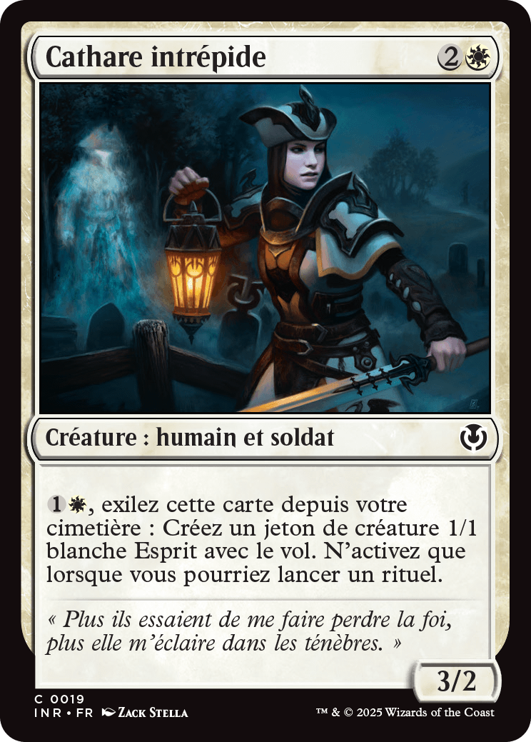 , exilez la Cathare intrépide depuis votre cimetière : Créez un jeton de créature 1/1 blanche Esprit avec le vol. N'activez que lorsque vous pourriez lancer un rituel.