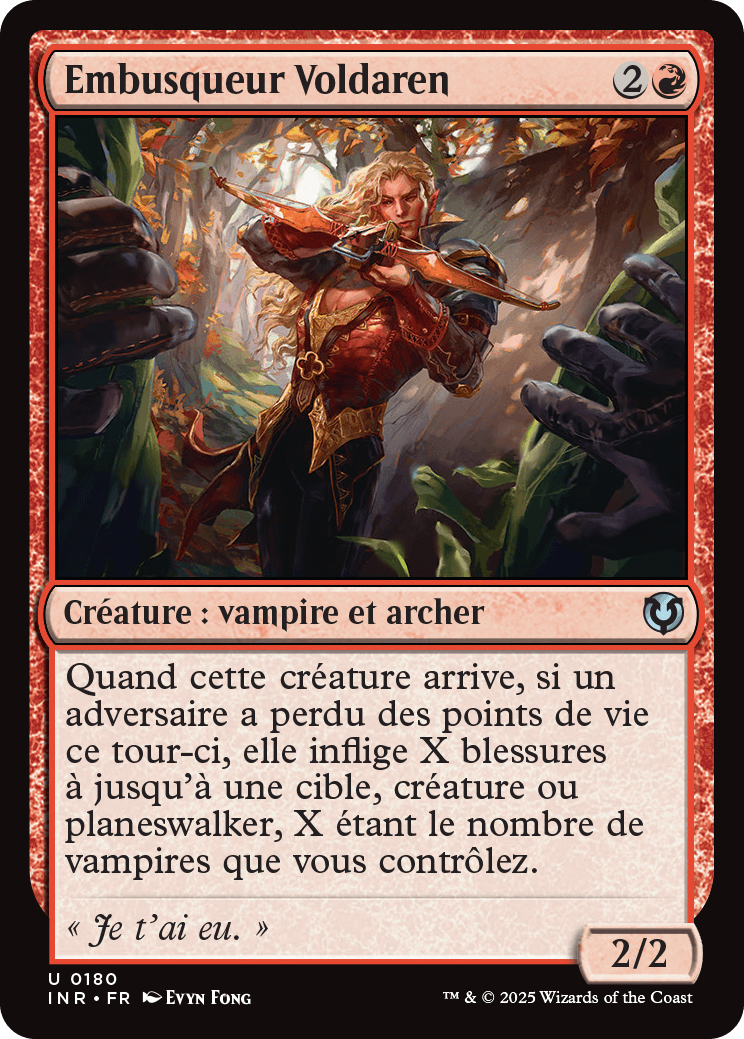 Quand l'Embusqueur Voldaren arrive, si un adversaire a perdu des points de vie ce tour-ci, il inflige X blessures à jusqu'à une cible, créature ou planeswalker, X étant le nombre de vampires que vous contrôlez.