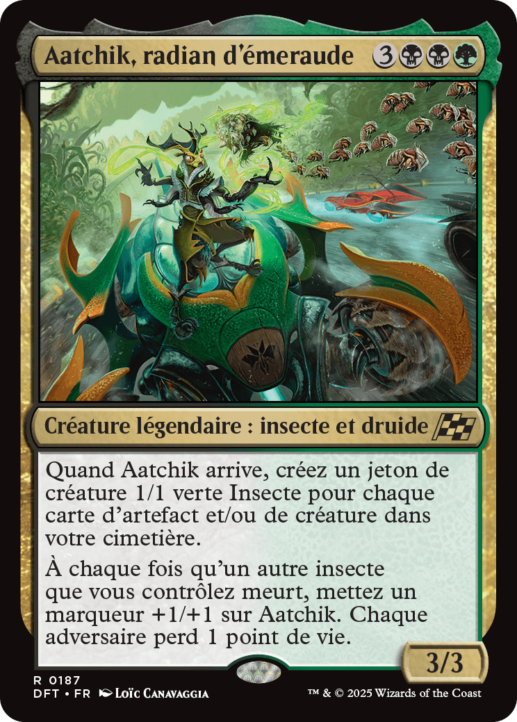 Quand Aatchik arrive, créez un jeton de créature 1/1 verte Insecte pour chaque carte d'artefact et/ou de créature dans votre cimetière.