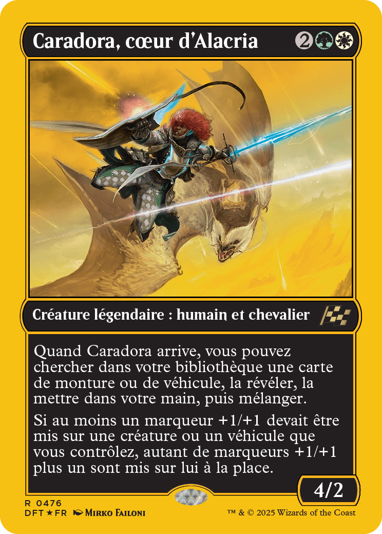 Ouand Caradora arrive, vous pouvez chercher dans votre bibliotheque une carte de monture ou de vehicule, la reveler, la mettre dans votre main, puis melanger.