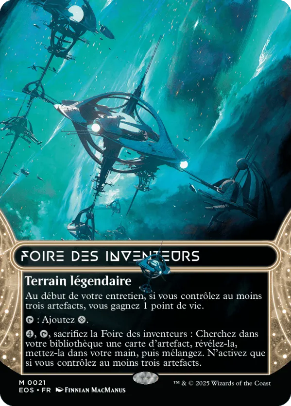 , , sacrifiez la Foire des inventeurs : Cherchez dans votre bibliothèque une carte d'artefact, révélez-la, mettez-la dans votre main, puis mélangez. N'activez que si vous contrôlez au moins trois artefacts.