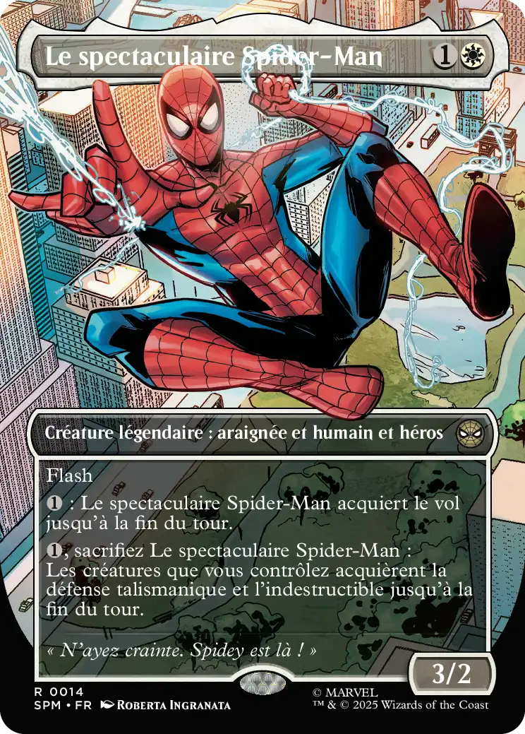 , sacrifiez Le spectaculaire Spider-Man : Les créatures que vous contrôlez acquièrent la défense talismanique et l'indestructible jusqu'à la fin du tour.Vous n'êtes pas connecté ! connectez-vous ou inscrivez-vous pour poster un commentaire
