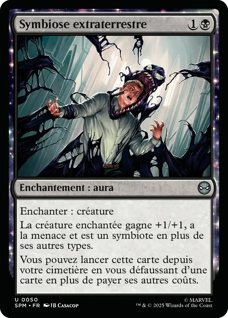 La créature enchantée gagne +1/+1, a la menace et est un symbiote en plus de ses autres types.
