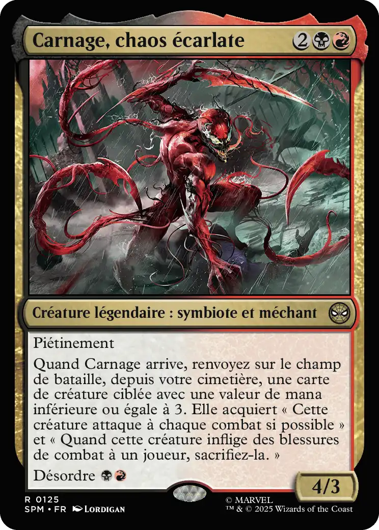 Quand Carnage arrive, renvoyez sur le champ de bataille, depuis votre cimetière, une carte de créature ciblée avec une valeur de mana inférieure ou égale à . Elle acquiert "Cette créature attaque à chaque combat si possible" et "Quand cette créature inflige des blessures de combat à un joueur, sacrifiez-la."