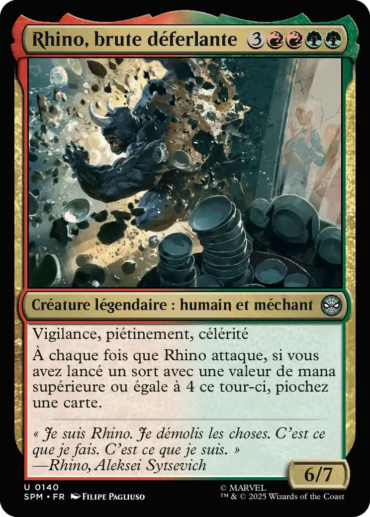 À chaque fois que Rhino attaque, si vous avez lancez un sort avec une valeur de mana supérieure ou égale à 4 ce tour-ci, piochez une carte.