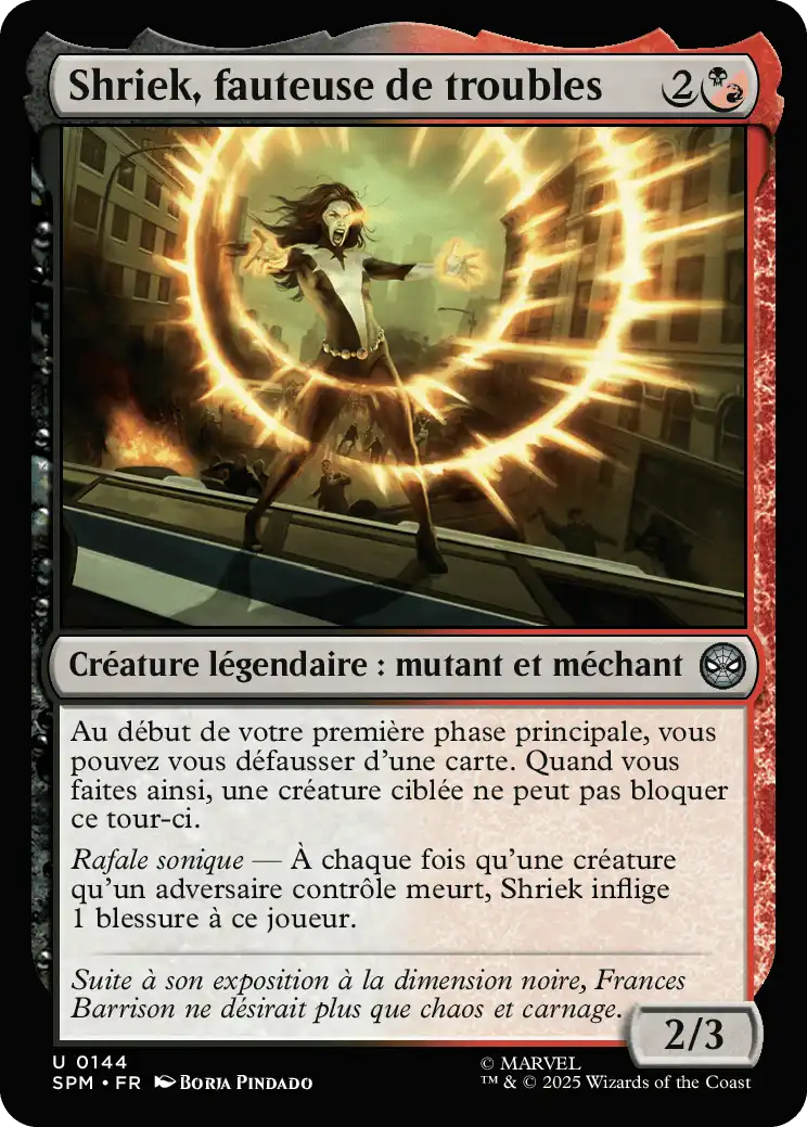 Sonic Blast — À chaque fois qu'une créature qu'un adversaire contrôle meurt, Shriek inflige 1 blessure à ce joueur.