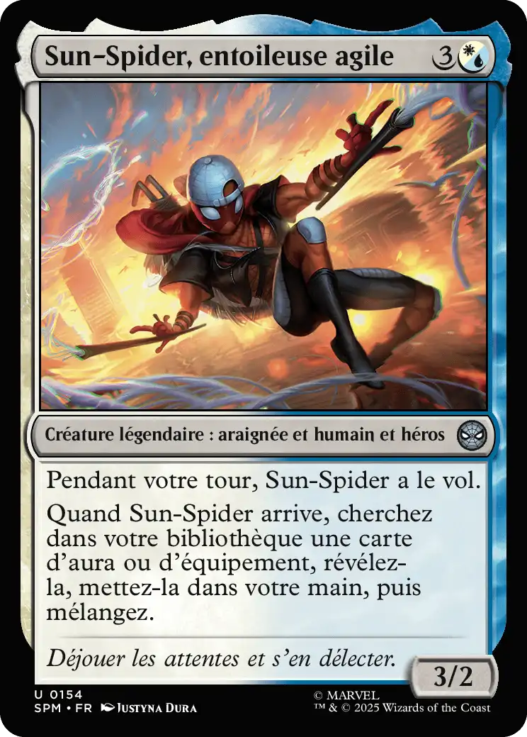 Quand Sun-Spider arrive, cherchez dans votre bibliothèque une carte d'aura ou d'équipement, révélez-la, mettez-la dans votre main, puis mélangez.