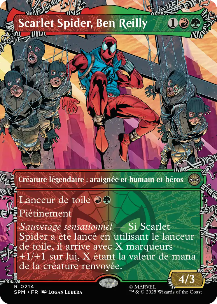 Sensational Save — Si Scarlet Spider a été lancé en utilisant le lanceur de toile, il arrive avec X marqueurs +1/+1 sur lui, X étant la valeur de mana de la créature renvoyée.