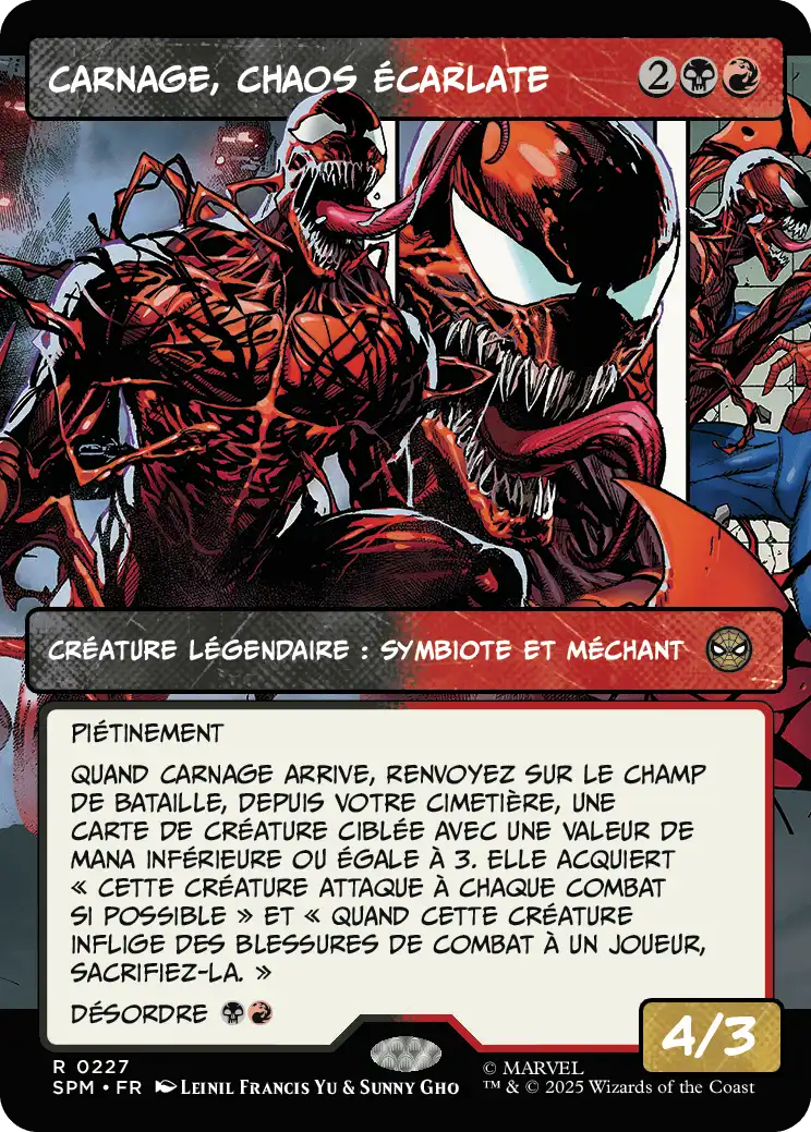 Quand Carnage arrive, renvoyez sur le champ de bataille, depuis votre cimetière, une carte de créature ciblée avec une valeur de mana inférieure ou égale à . Elle acquiert "Cette créature attaque à chaque combat si possible" et "Quand cette créature inflige des blessures de combat à un joueur, sacrifiez-la."