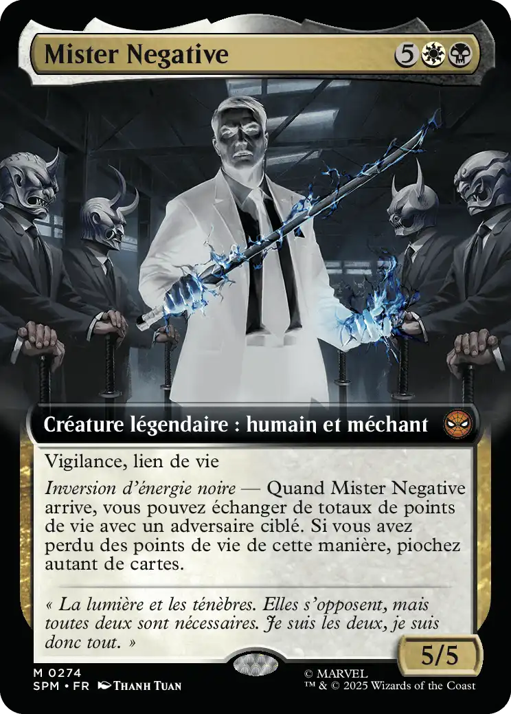 Inversion d'énergie noire — Quand Mister Negative arrive, vous pouvez échanger de totaux de points de vie avec un adversaire ciblé. Si vous avez perdu des points de vie de cette manière, piochez autant de cartes.