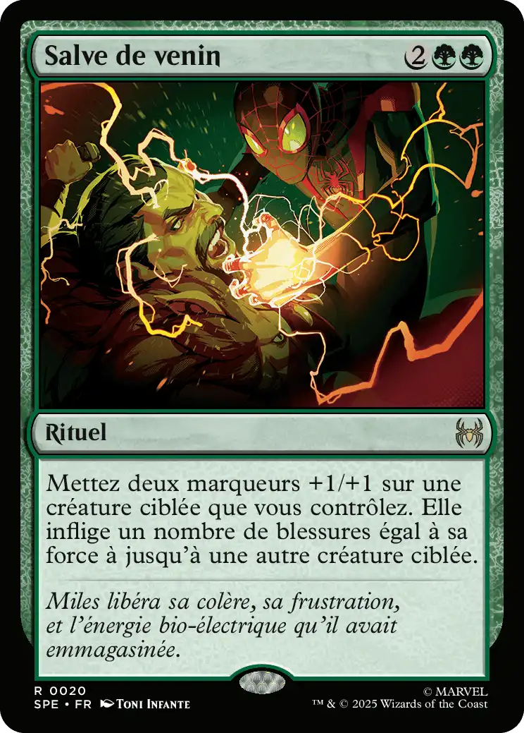 Mettez deux marqueurs +1/+1 sur une créature ciblée que vous contrôlez. Elle inflige un nombre de blessures égal à sa force à jusqu'à une autre créature ciblée.
