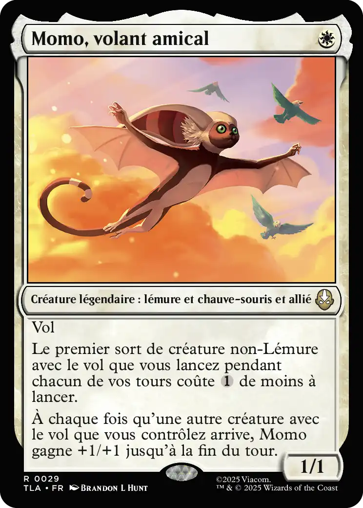 À chaque fois qu'une autre créature avec le vol que vous contrôlez arrive, Momo gagne +1/+1 jusqu'à la fin du tour.