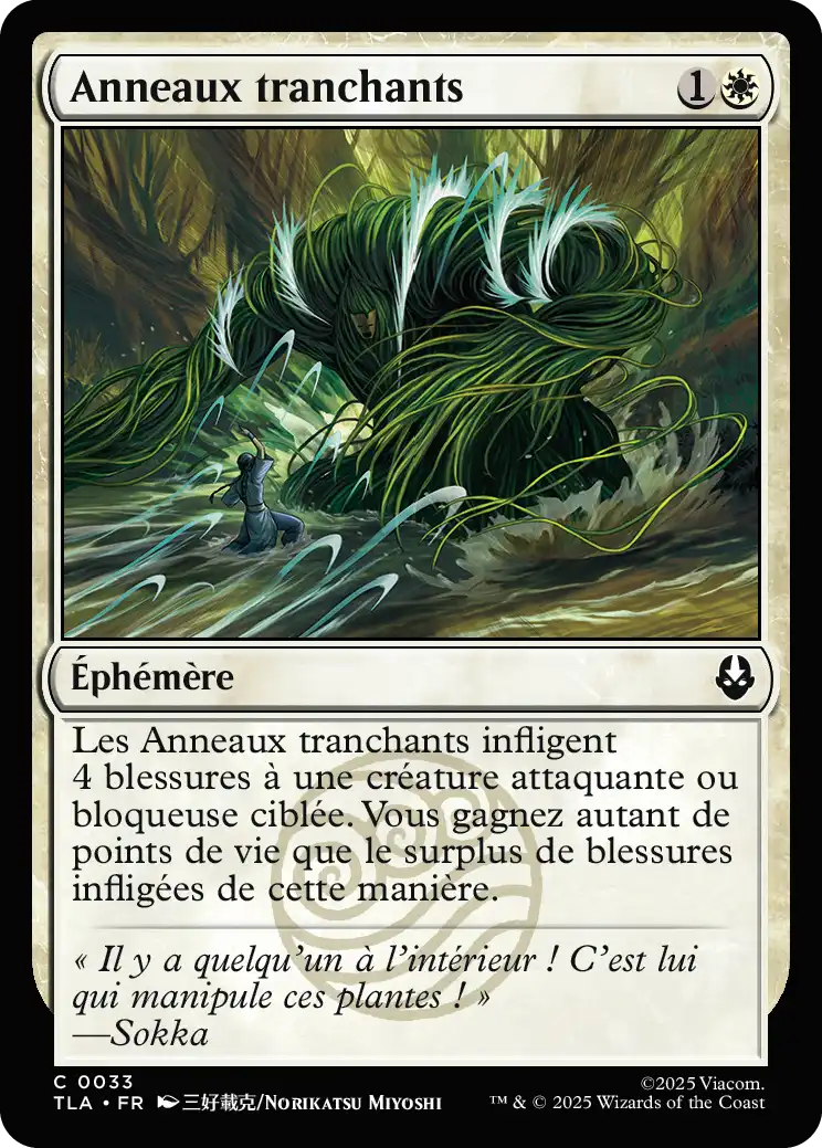 Les Anneaux tranchants infligent 4 blessures à une créature attaquante ou bloqueuse ciblée. Vous gagnez autant de points de vie que le surplus de blessures infligées de cette manière.